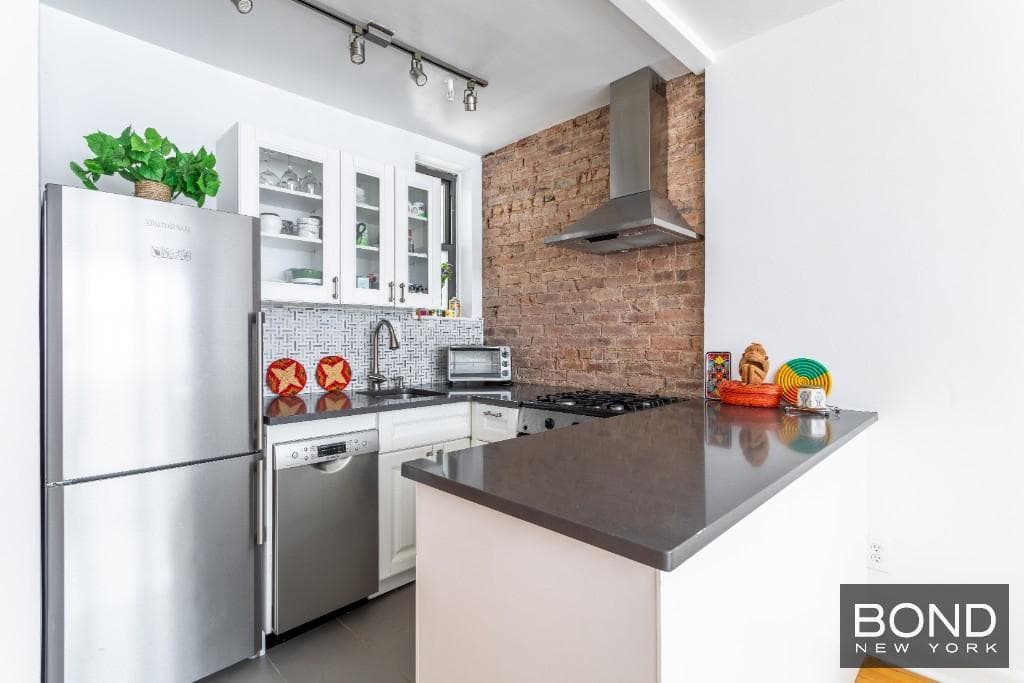 OPEN KITCHEN, STAINLESS STEEL APPLIANCES, DISHWASHER & EXPOSED BRICK.